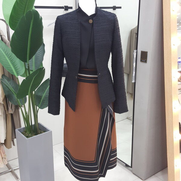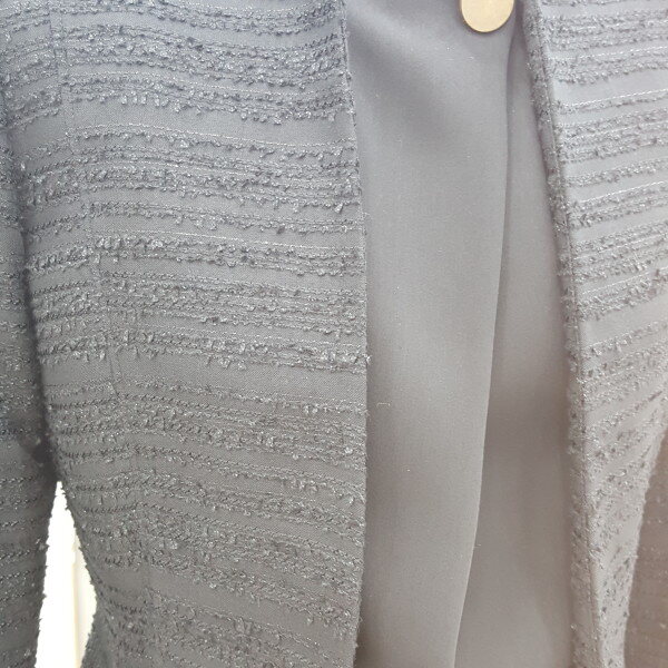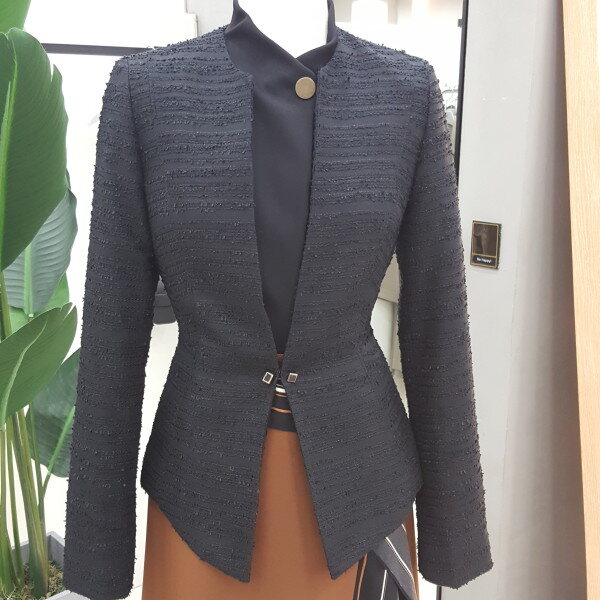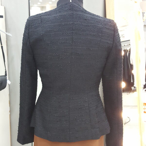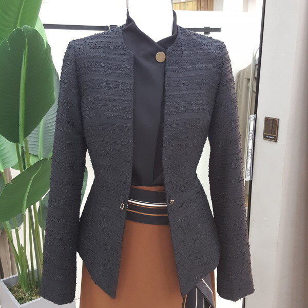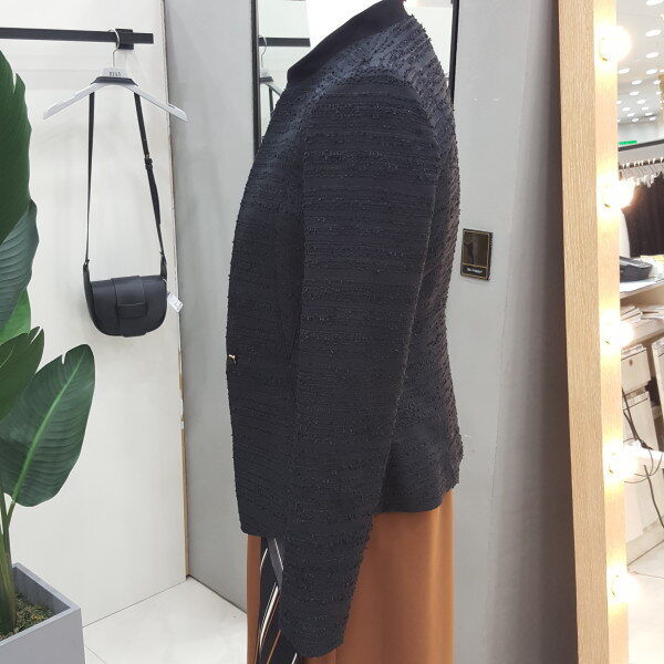 블랙 컬러에 트위드 원단으로 고급스럽고 실루엣이 여성스러운 원버튼 자켓입니다. 원피스나 스커트와 스타일링하기 좋습니다.