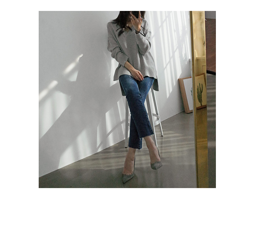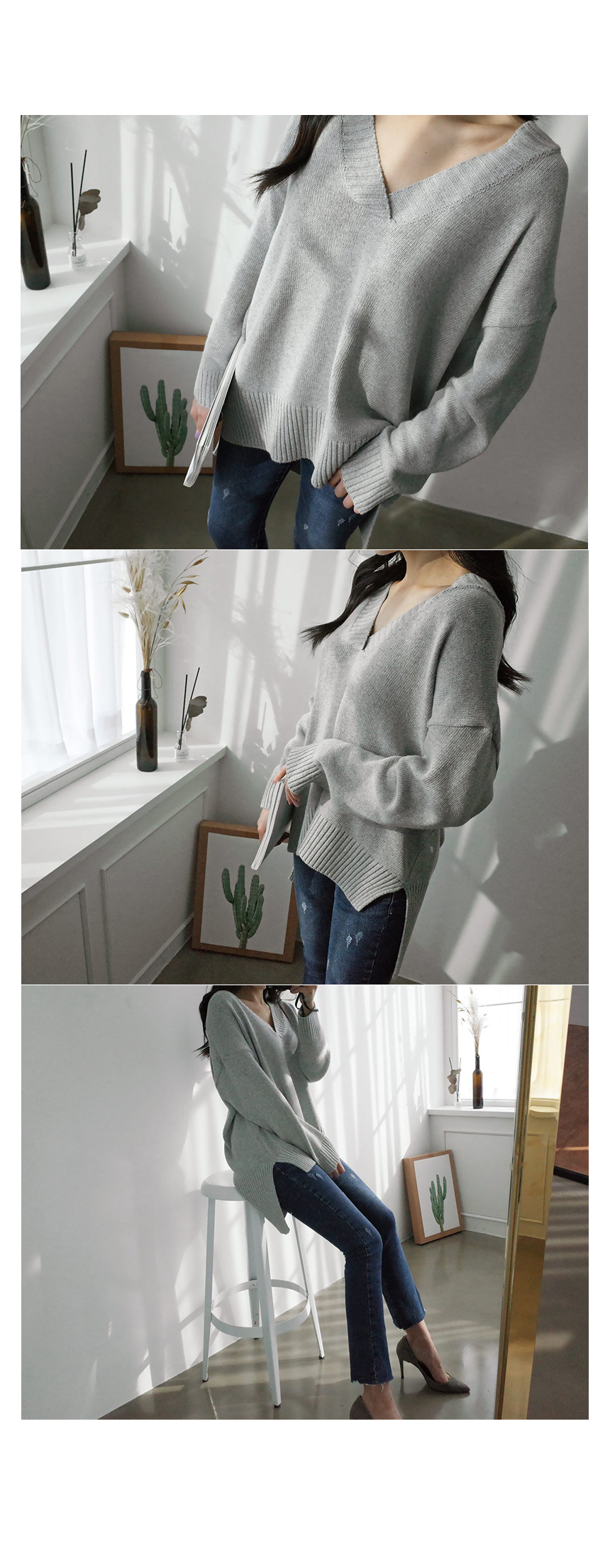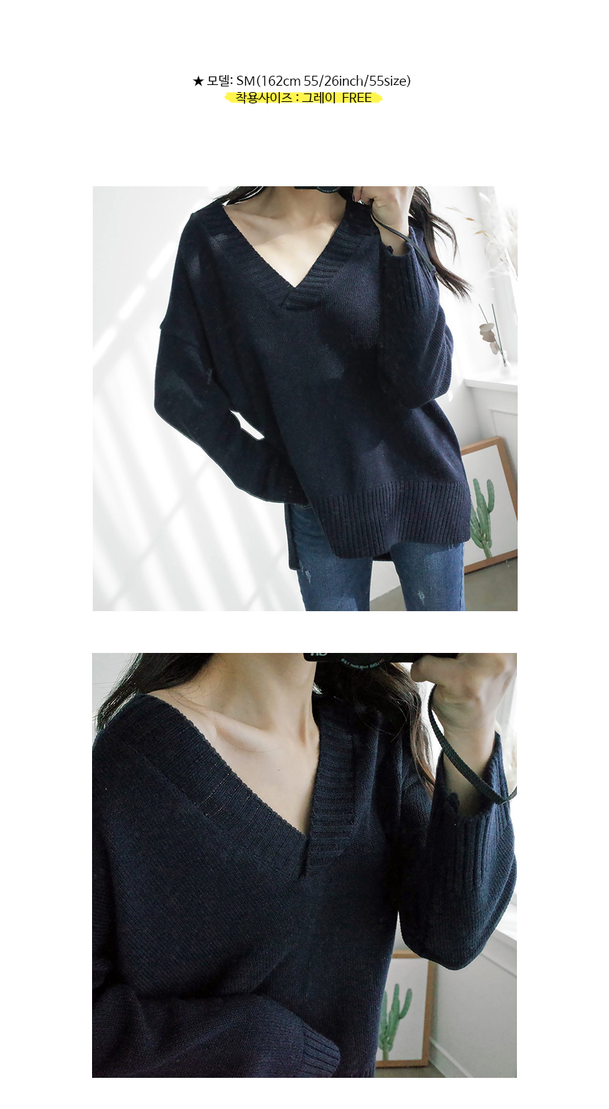편안하게 떨어지는 내추럴 핏으로 목선이 우아하게 드러나는 알맞은 깊이의 브이넥이 여성스러운 니트랍니다 앞라인의 길이는 골반선을 덮는 산뜻한 길이로 뒷라인은 힙을 덮어 슬림한 하의와 코디해도 부담 없이 편하게 입기 좋은 아이템이랍니다 울 50%함량으로 부드럽고 두껍지 않지만 포근해 간절기 단독으로 입기 좋아요 색상은 아이보리, 그레이, 네이비, 블랙 사이즈는 FREE44~77