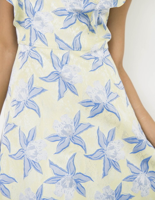 春らしい軽さのあるジャガード生地を使用したフリルたっぷりのワンピース。春らしい色の組み合わせが可愛く生地を見てるだけでテンションが上がります♪ウエストからすっきりとしたシルエットで広がるフレアが子供っぽくなり過ぎない絶妙なXシルエットで、スタイルが良く見える嬉しい効果も♪