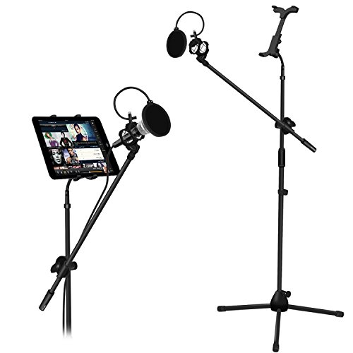 -. Feature : [Kit includes]-Tripod Floor Stand with Boom + Adjustable Tablet Holder + Pop Filter + Shock Mount Holder + Spiral Tube. / [adjustable tripod floor stand]-30"-51.6"/77cm-131cm height adjustable tripod floor stand with tablet holder. Great tool to hold your ipad or other tablets while singing or speaking / [Tablet holder]-Tablet holder can be adjusted from 4.8"/12.3cm to 9.4"/24cm. Works with iPad, Kindle, Nexus, Samsung, Androids, etc. PLEASE verify the size of your tablet BEFORE ORDERING / [Built with strong metal tubes]-Tripod base with rubber end caps for excellent sturdiness and anti-vibration. Comes with 24.78"/62.9cm long boom, pop filter and mic shock mount holder of 1.7"/4.3cm diameter / [Pop Filter]-Protects your microphone from surplus spit caused by over eager performers.