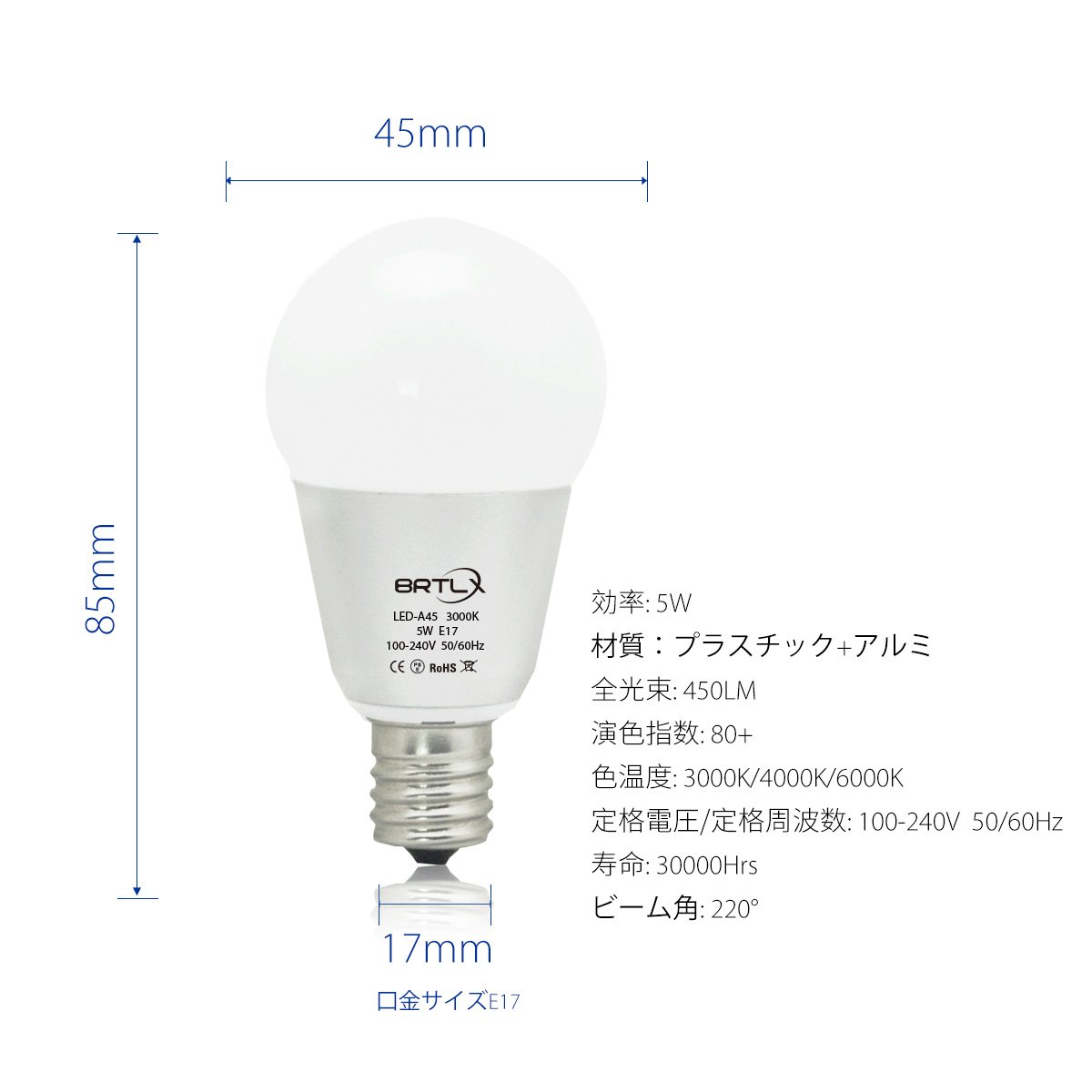Size: E17: Diameter 45 × Total length 85 mm