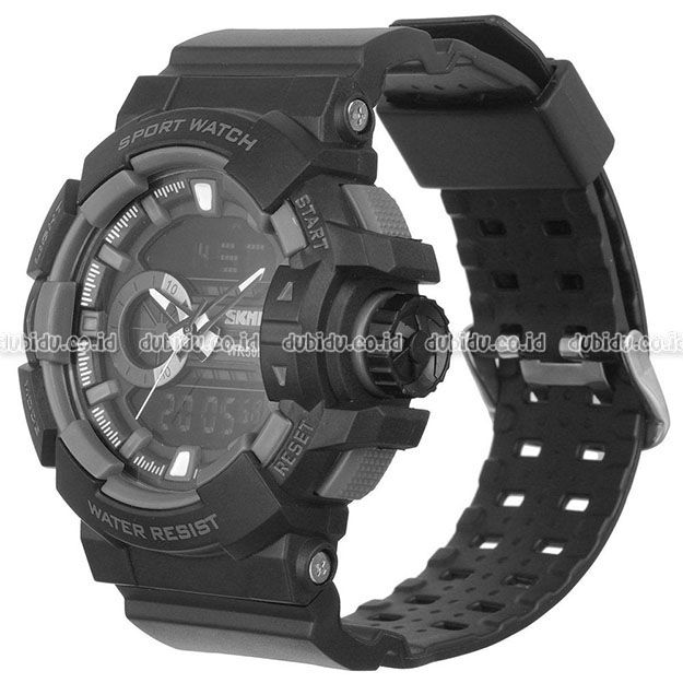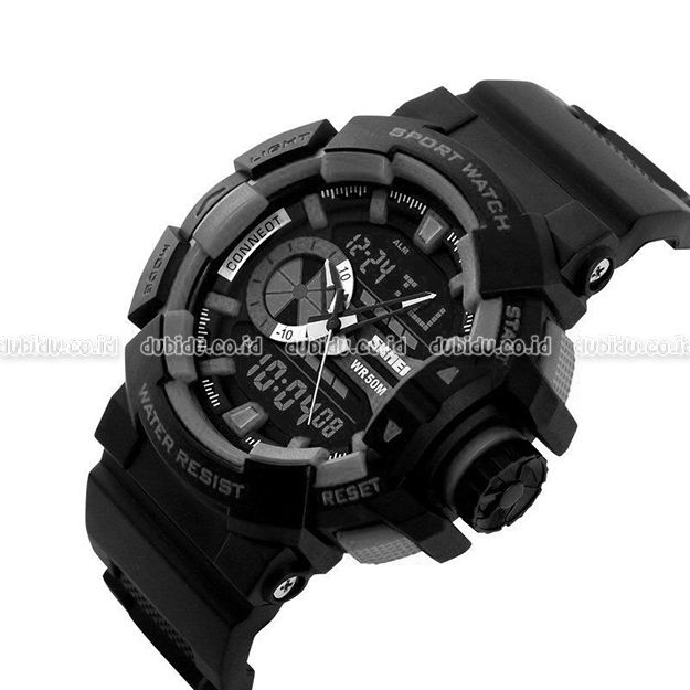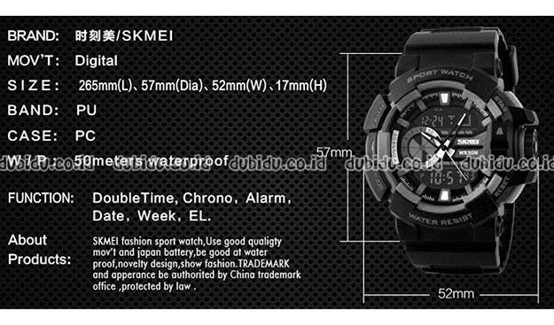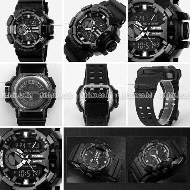 SPESIFICATIONS Brand : SKMEI Sports watches Model Number : 1117 Style : Fashion & Casual Sport Band Material : Polyurethane (PU) Case Material : PC Material Case Finish : Matte Mirror Material : Glass Resin Display Mode : Analog & Digital Movement:Digital & Quartz Watch Shape : Round Case Size(L*W*H) : 57mm * 52mm * 17mm (5.7CM) Water Resistance Rating : 50m(5ATM) Full Length : 265mm Max Wear Perimeter : 240mm Min Wear Perimeter : 170mm Dial Display : Analog-Digital Dial Window Material Type : Glass Feature : Alarm,Day,Led Display Gender : Men Movement : Double Japan Movement 12/24 hour time format Style : Simple Water Resistance Depth : 50m Battery : CR2025 Band Material Type : Resin Band Length : 24 cm Case Thickness : 17mm Movement Model : Quartz Digital Watch Feature: Auto Date,Alarm,Chronograph,Water Resistant,Complete Calendar,Back Light Weight : 100 Gram
