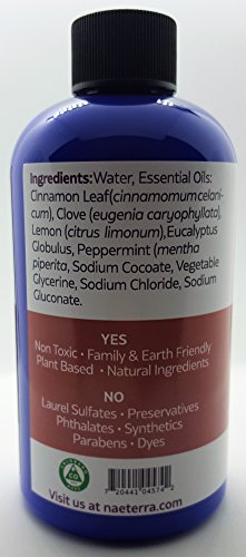 -. Feature : Synthetic Free / No Harmful Chemicals / Made with Plant Based Ingredients / Concentrated - Dilute before use! / Made with Clove, Cinnamon, Eucalyptus, Lemon, Peppermint and Rosemary Essential Oils
