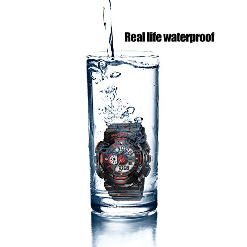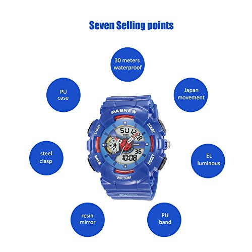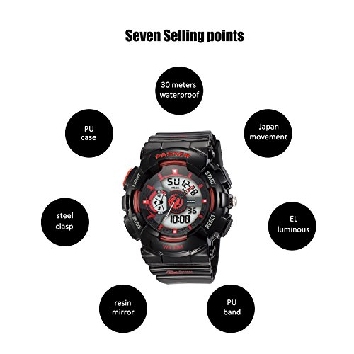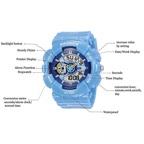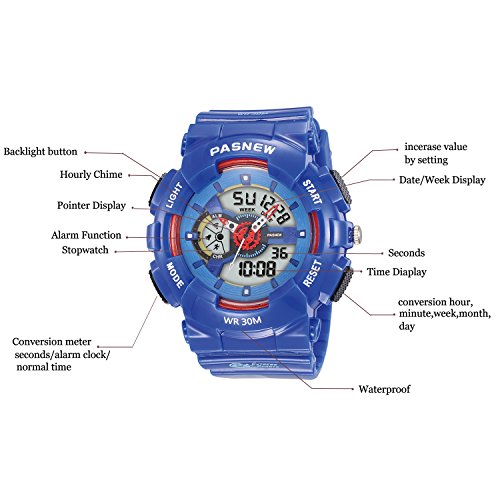 -. Feature : MULTI-PURPOSE KID FRIENDLY: A water-proof face and tough, flexible rubber watch band enable this sports watch for kids' perfect for playing, climbing, exercise, outdoor exercises, and every single thing a parent needs to keep kids moving. / MULTI-FUNCTIONAL: Calendar Date Week Month, Alarm, time/date, EL night-light makes it easier to see time in bright light, boasts 3 ATM water-resistant for swimming, Alarm, Stopwatch, Hourly chime, 12/24 hour for mart / WATCH DESIGN CASE: white bezel and a black dial featuring with many clear windows, date, day, 12/24Hour time, alarm, second etc. are displaying very clear and simple to read. Bright backlight makes the time visible even in the dark. / KINDLY NOTE: Please AVOID PRESSING any buttons in the water. Prevent the waterproof ring from been damaged by keeping it away from steam and hot water / PERFECT GIFT FOR BOYS AND GIRLS: This new innovative watch looks like it has one eye on the face and the day of the week featuring a different stunning for a visual reminder; perfect holiday and birthday gift for Boys and Girls with 180 days Quality Guarantee.