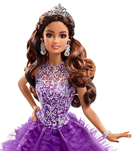 Feliz Quinceañera! From the beautiful ceremony presenting a young woman to family and friends, to the festivities, Quinceañera Barbie doll is excited to celebrate a young woman's 15th birthday. She's dressed in a flowing, royal purple quinceañera gown adorned with tulle ruffle accents and sparkling bodice details just for the occasion. Gracing her flowing brown curls is a traditional tiara that is the perfect complement to her shimmering drop earrings. This beautiful doll makes the perfect keepsake to mark this special day and celebration.Feature