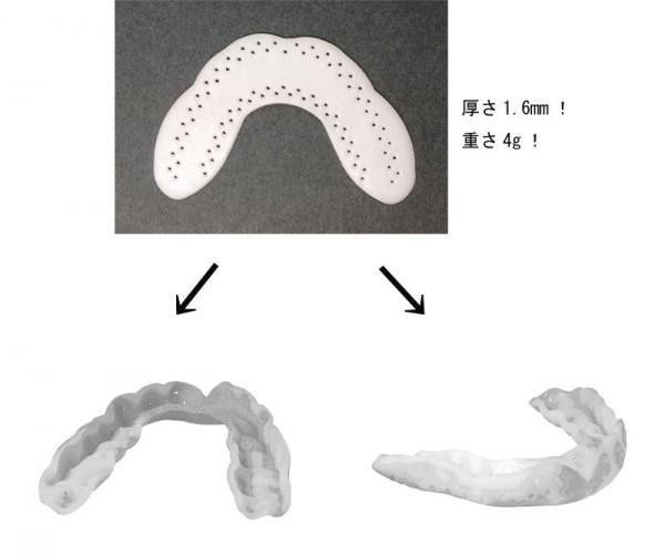 | 歯を守る為、強さ・快適さ・取付け具合を追求、科学的実験を繰り返して行い、現在の形になりました。厚み僅か1.6mmで、重さ僅か4g!しかし驚異的な耐久力です。その薄さが装着時の違和感を最少化しました。土壌に埋めると、分解して土になります。 |