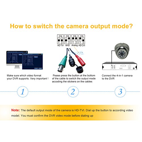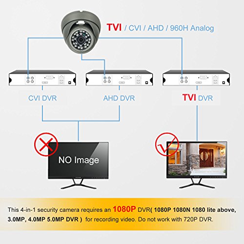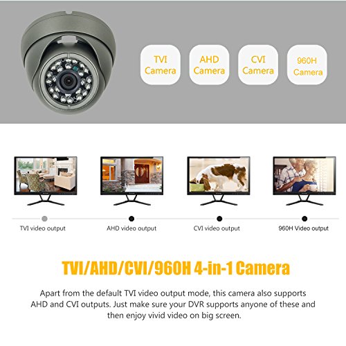 -. Feature : 1. Enjoy HD images with this 2 Megapixels 1080p HD TVI/CVI/AHD/960H(700 TVL) 50ft IR dome security camera while you cost-effectively monitor your home or business, it features a 3.6 mm lens with a 75° Field of View (FOV) to cover large areas. / 2. This dome camera has 4 IN 1 Resolution Output - Supports HD-TVI, HD CVI, AHD and 960H Analog technologies making it possible to use with TVI DVR, CVI DVR, AHD DVR and analog DVR, providing flexibility for your security applications. Default Video MODE is 1080P TVI MODE, Compatible with all TVI DVRs. 1080P Video Mode must be switched according to your 1080P DVR type. / 3. OSD Control Over Coax - Easy control of your camera OSD settings. This device offers easy adjustment of your camera OSD settings over coax cabling, eliminating the need for running an additional data cable. / 4. This outdoor camera also features an extreme -40°F ~ 140°F operating temperature range, and an IP66 weather-rated housing that provides protection from the elements, including dust and sand, as well as rain and snow. / 5. Note: This 4 in 1 security camera requires an DVR for recording video.You could switch the video mode according to the DVR that you use. If you met any problem, please feel free to contact us.