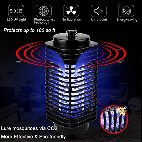 Advanced Photocatalyst Bug Zapper: No Chemical, Non-Toxic, Totally Eco-Friendly, safe for the pregnant and infants, lure the mosquitoes/flies/ Moths and other bugs via CO2 that imitates human breath, which is extremely attractive for mosquitoes, and much more effective than UV light, and then kills them by electric shock