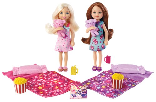 Barbie Chelsea Slumber Party Chelsea doll and her friend are having so much fun at their slumber party. They are watching the latest Barbie movie while eating popcorn, drinking juice, and cuddling up with their teddy bears. When it's time for bed, they can curl up in their sleeping bags.
