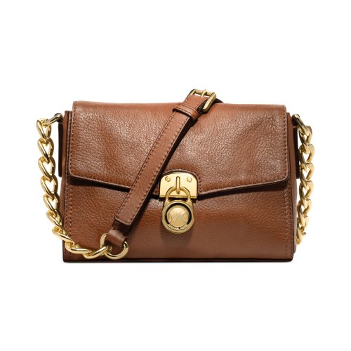 -. Feature : MICHAEL Leather bag / Adjustable crossbody strap with 22" drop Magnetic snap closure / Gold-tone hardware; logo lock at front; chain detail at strap / Interior features slip pocket / 8" W x 6" H x 2-1/2" D
