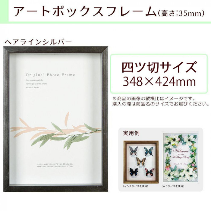 深さ25ミリの立体の木製額。フィギュアBOXとして、フラワーアレンジメントやウェディングボードとしても最適。 製造国:日本 素材・材質:フレーム:木、前面:ガラス 重量:約1520g 仕様:規格:四ツ切(内寸:348×424mm)壁掛け専用 付属品:紐 ※サプライヤー直送品 ご注文後9~12営業日後の出荷となります【商品名】A.P.J. BOXフレーム アートボックスフレーム(高さ:35mm) 四ツ切サイズ(348×424mm) ヘアラインシルバー 1000015188