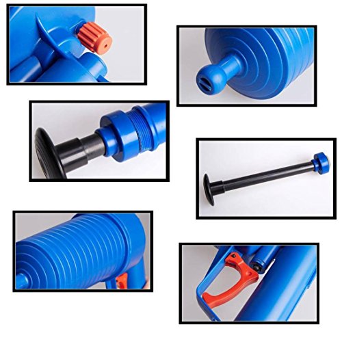 -. Feature : Material: ABS gun body, rubber blocked head / Color: Blue&Black / Dimensions: 10.8" x 11" x 3.7" / Type of pipeline: suit for hard pipe: cast iron pipes, PVC pipes, PPR pipes; Not suit for soft pipe: rubber hose, plastic hose, others. / Type of blockage: suit for: hair, vegetable, accessory; Not suit for: urine alkali, cement, hard object. It can effectively remove hairs, cloth, tea, vegetable, rubbish from pipeline.