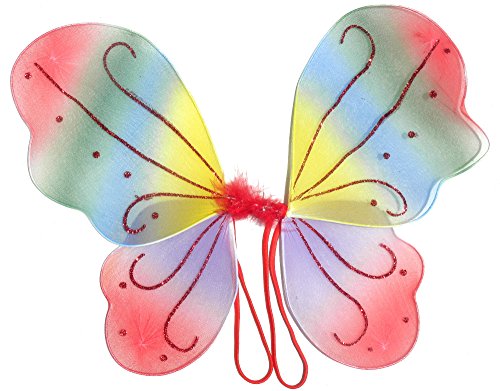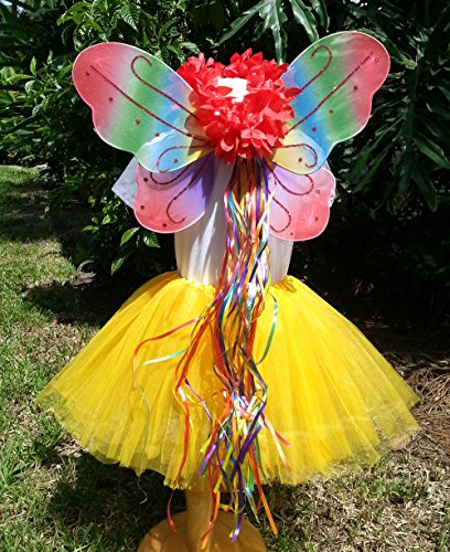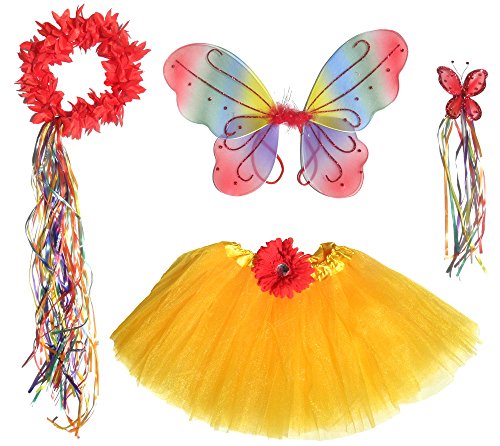 -. Binding : Toy -. Brand : Fairytale Play -. Color : red, blue, green, yellow, orange -. Department : girls -. EAN : 0701722745841 -. Feature : This set just says FUN all over it in bright party colors and sparkles. / Butterfly wings in red sparkles and multi colored design. / Detachable flower clip on the tutu. / Bright orange tutu in layers of tulle and satin waistband is 12' in length. / The ribbon halo captures all the colors in the entire set with long flowing ribbons that capture the light. -. IsAdultProduct : 0 -. MPN : 3279594 -. PackageQuantity : 5 -. PartNumber : 3279594 -. ProductGroup : Toy -. ProductTypeName : TOYS_AND_GAMES -. Size : medium -. Title : 5 Pc Girls Rainbow Fairy Set with Matching Wand, Headband & Hairclips -. UPC : 701722745841