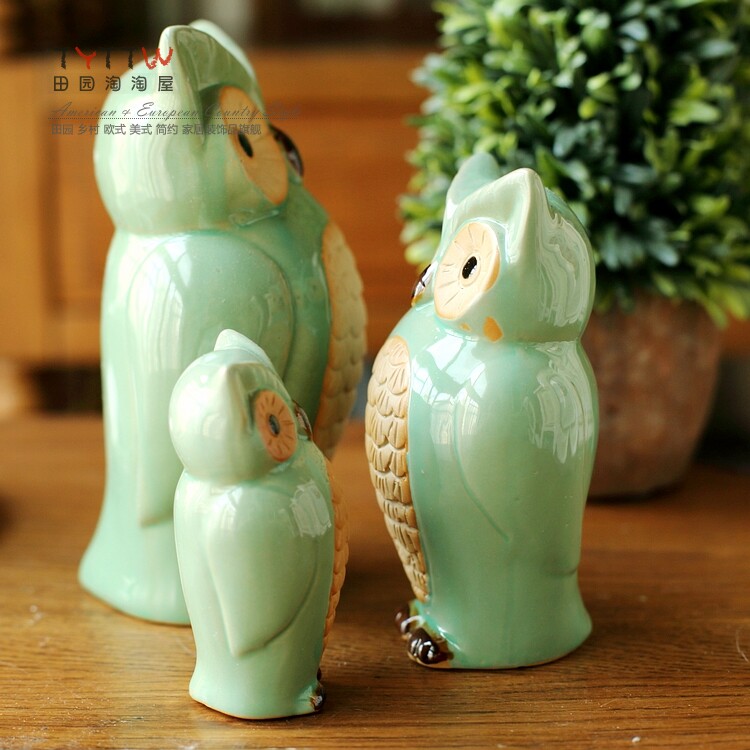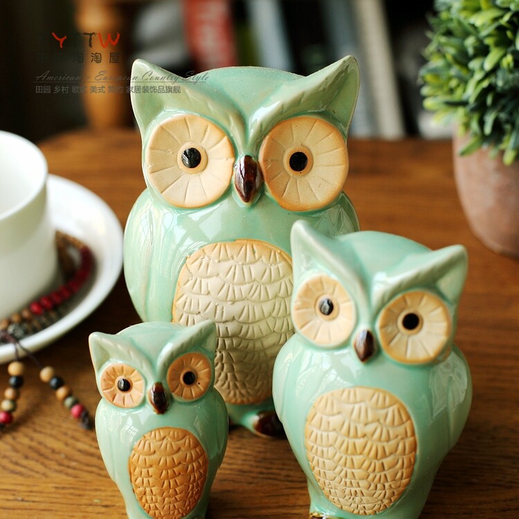 美式乡村风格陶瓷釉面蓝色猫头鹰装饰家居摆件
