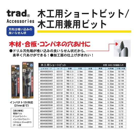 ドリル刃先端が喰いこみの良いらせん状なので素早く穴あけができます。加工面の仕上げがきれいです。適応機種 電気ドリル・インパクトドライバー12V以上)・ドリルドライバー・ボール盤