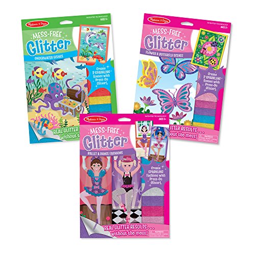 Make fun and sparkling scenes with press-on glitter! This three-pack includes Melissa & Doug's Mess-Free Glitter Underwater, Flower and Butterfly, Ballet and Dance Fashions. Our patented technology lets kids get the look and feel of real glitter without the mess. Just peel away a section of white paper from the cards to reveal the sticky surface, then select a colored glitter sheets (five in each set) to press on for instant sparkling art. Two double-sided cards to decorate are included in the Ballet and Dance Fashions set, and there are two scenes in Underwater and Flower & Butterfly.Feature