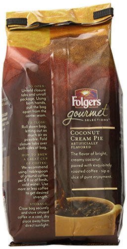 Perfect for an after-dinner treat. Folgers Gourmet Selections Coconut Cream Pie has the flavor of bright, creamy coconut paired with exquisitely roasted coffee. Sip a slice of pure enjoyment.