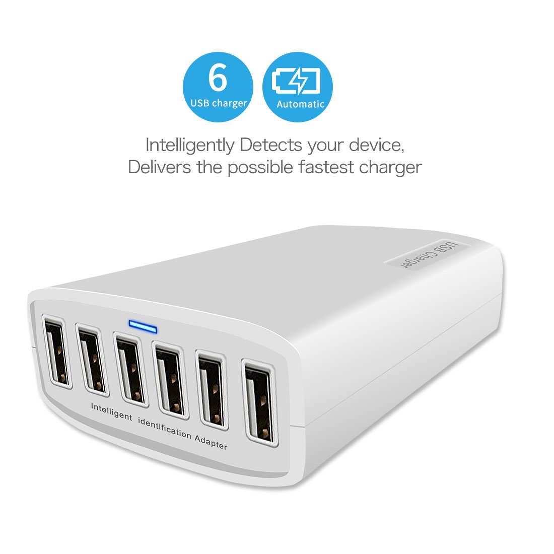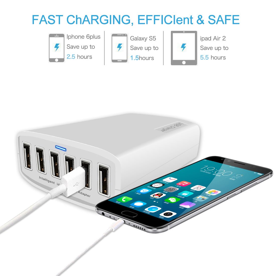 There are six USB ports, so you can quickly charge up to 6 smartphones and tablets at the same time, such as iPad, iPhone, Android.