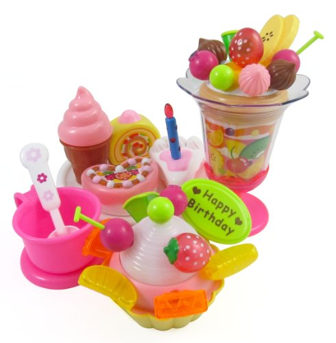 Includes cake slice, heart cake, sponge cake, ice cream, sundae, cup and spoon