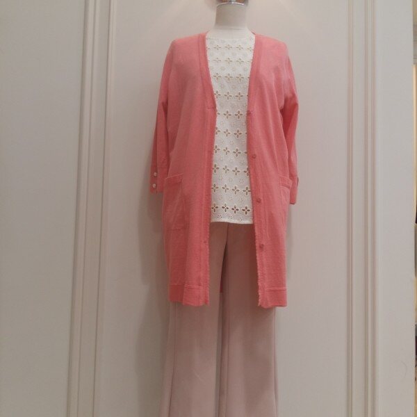 린넨/나일론 혼용의 수입사를 사용한 가디건. 기본실루엣에 소매 장식단추로 포인트를 줌.