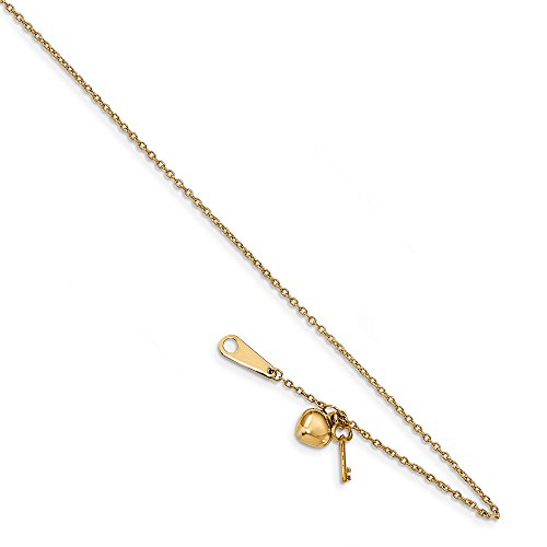 Express your love with this meaningful heart and key anklet crafted from polished 14k yellow gold. It features a 7mm (1/4 inch) hollow puffed heart, a 9mm (3/8 inch) long key and a delicate 0.8mm width, 10-inch long cable chain that costs with a spring ring clasp.Feature