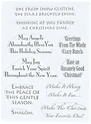 -. Binding : Misc. -. Brand : Stampers Anonymous -. EAN : 0794504707359 -. Feature : These clear stamps peel off their backing and stick to any acrylic block making for easy stamping / Simply apply your favorite ink and stamp crisp clear images! Available in a variety of designs (each sold separately) / Made in USA -. Label : Stampers Anonymous -. Manufacturer : Stampers Anonymous -. Model : SFC-16 -. MPN : SFC-16 -. NumberOfItems : 1 -. PackageQuantity : 1 -. PartNumber : SFC-16 -. ProductGroup : Art and Craft Supply -. ProductTypeName : HOME -. Publisher : Stampers Anonymous -. Size : 8"X4.5" -. Studio : Stampers Anonymous -. Title : Stampers Anonymous Words to The Rescue Clear Stamp Set, 8-Inch by 4.5-Inch, Christmas 2 -. UPC : 794504707359