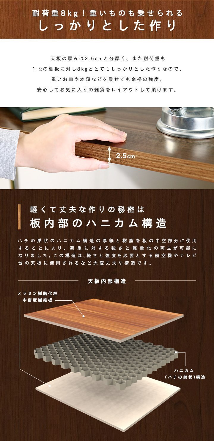 The thickness of the top board is 2.5 cm thick and the loading capacity is 8 kg against the shelf board of one step so it is made very firmly,