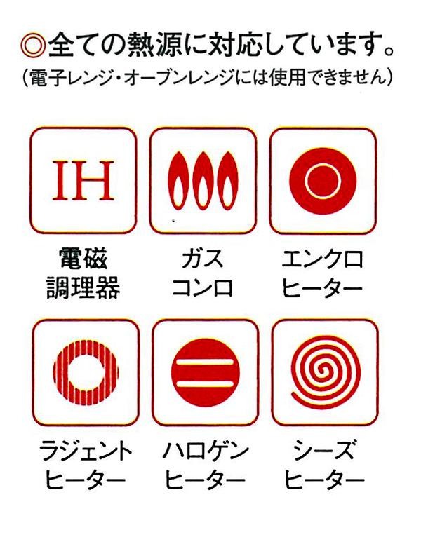 | 仕様 | 底厚:約0.6mm 容量:約1.5L(適正容量:約1L) 対応熱源:ガスコンロ、IH(100・200V)、シーズヒーター、ハロゲンヒーター、エンクロヒーター、ラジエントヒーター 電子レンジ・オーブンレンジ使用不可 食器洗浄機使用不可 |