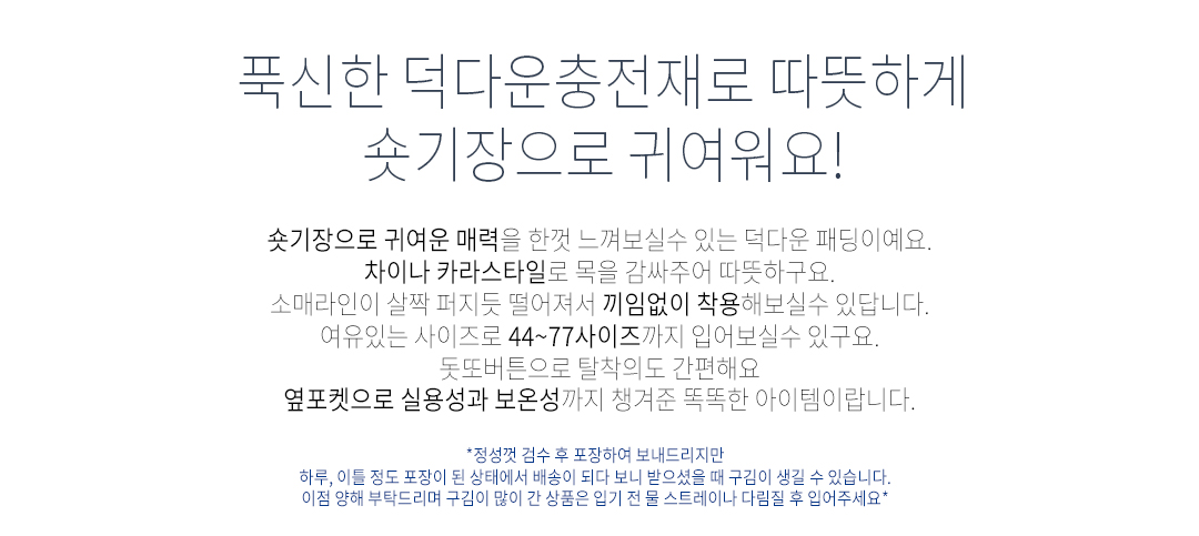 겉감폴리(polyester/)100%안감폴리(polyester/)100%충전재오리솜털(duckdownyhair/)100%(가슴털50%+날개털50%)