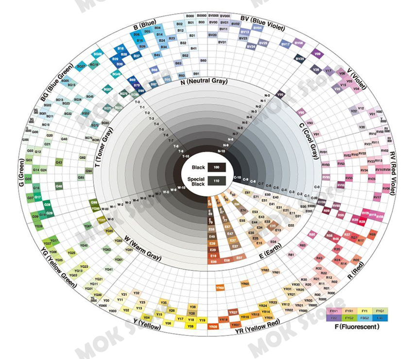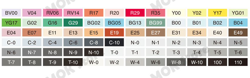 - 72 Colors : W0, W2, W4, W6, W8, W10, T0, T1, T2, T3, T4, T5, T6, T7, T8, T9, T10, 100, C0, C2, C4, C6, C8, C10, N0, N1, N2, N3, N4, N5, N6, N7, N8, N9, N10, 110, BG13, BG99, B00, B01, B02, B04, E04, E07, E11, E13, E15, E19, E25, E27, E31, E34, E40, E49, BV00, V04, RV06, RV14, R17, R20, R29, R35, Y00, Y02, Y17, YG01, YG17, G02, G16, G29, BG02, BG05