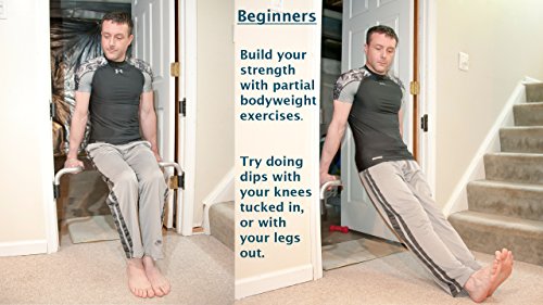 BEGINNERS will get a lot of value by setting up the dip bars lower on the doorframe- allowing your legs to take some of your weight. Focus on your form while you get stronger because everybody starts somewhere! Set DIPGRIPS higher on the door frame to do full body weight/full range of motion exercises!