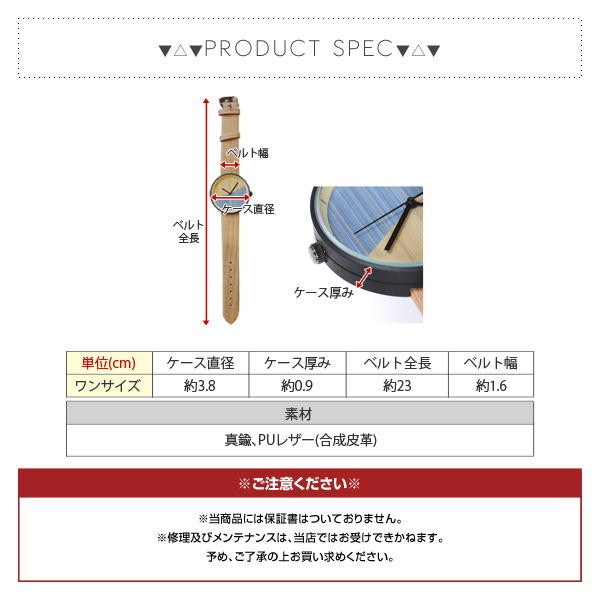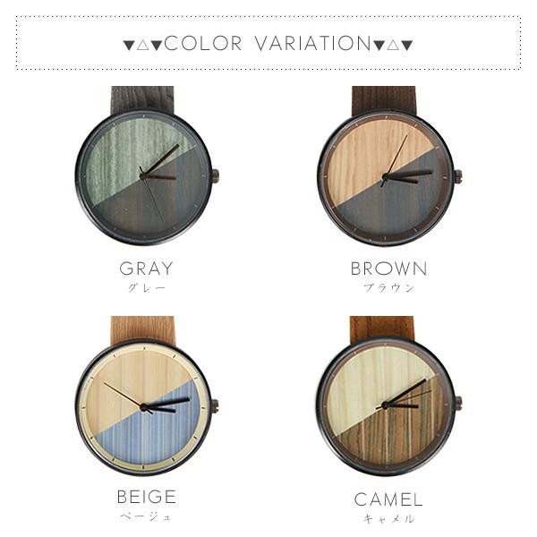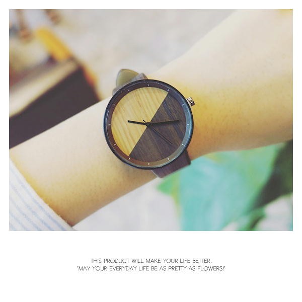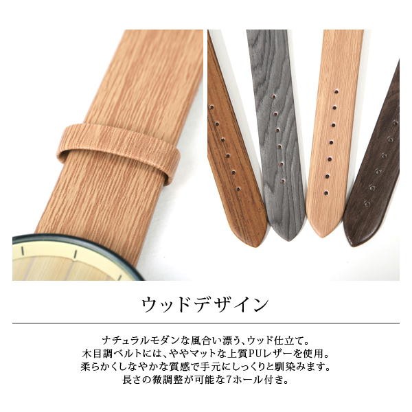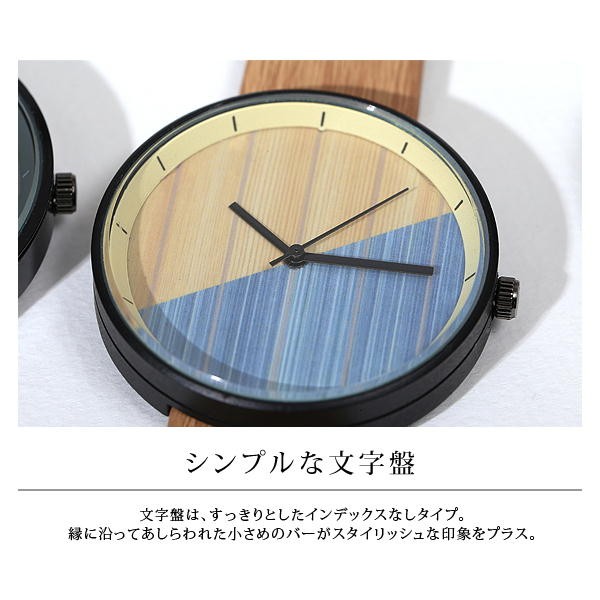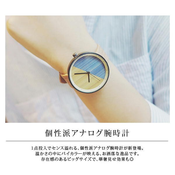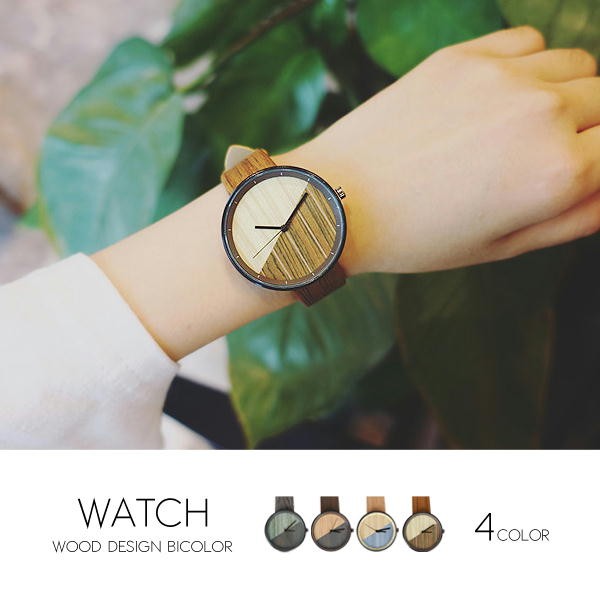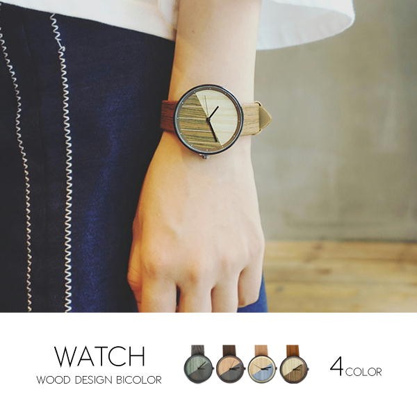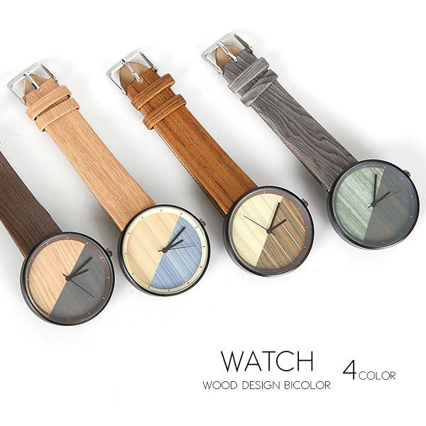 ★全4色!ウッドデザインバイカラーウォッチ★デイリーユースに最適!個性的な腕時計です。ナチュラルモダンな風合い漂う、ウッド仕立て。温かさの中にバイカラーが映えるオシャレな時計です。木目調ベルトには柔らかくしなやかで手元にしっくり馴染む、上質PUレザーを使っています。文字盤は、すっきりとしたインデックスなしタイプ。縁に沿ってあしらわれた小さめのバーがスタイリッシュな印象をプラス。長さの微調整が可能な7ホール付き!年代や性別を問わないユニセックスデザインなので、ご自身用はもちろん、ペアのお揃いにもおすすめです。■商品詳細■画像8枚目を参照してください。※当製品には保証書はついておりません。※修理及びメンテナンスは当店ではお受けできません。 予めご了承ください。※電池は内蔵しております。※注意事項※商品画像はできる限り実物の色に近づけておりますが、モニター・パソコン等の画像解像度により実際の商品と多少色味が異なる場合がございます。サイズは平置きサイズとなりますので、測り方により誤差が出る場合がございます。予めご了承くださいますようお願いいたします。