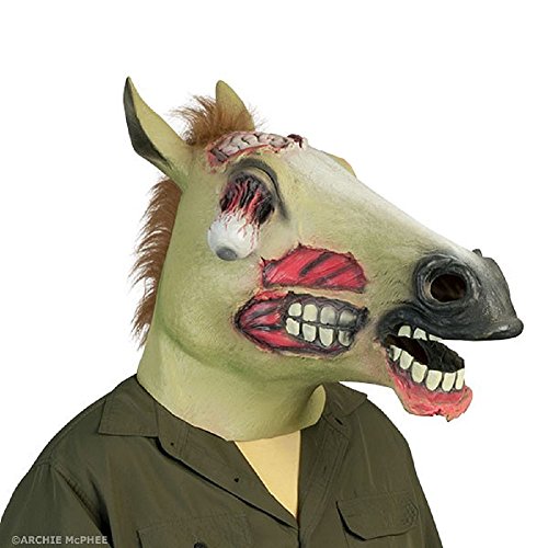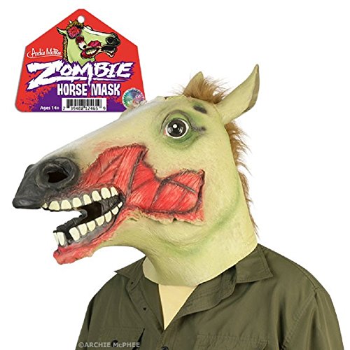 -. Brand : Archie McPhee -. Color : Multicolored -. Department : unisex-adult -. Feature : Latex Horse Mask / Realistic Rotten Flesh, Dangling Eyeball And Faux Fur Mane / Glows In The Dark After Exposure To Bright Light / Intended For Ages 14 And Up / Sized To Fit Most Teens & Adults -. Label : Accoutrements -. Manufacturer : Accoutrements -. PackageQuantity : 1 -. ProductGroup : Apparel -. ProductTypeName : ADULT_COSTUME -. Publisher : Accoutrements -. Size : One Size Fits Most Adults -. Studio : Accoutrements -. Title : Adult Latex Zombie Horse Glow In The Dark Costume Mask -. UPC : 736649587557