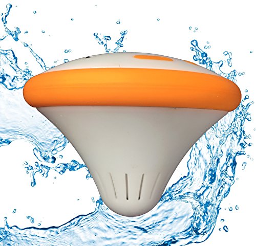-. Feature : DESIGNED TO FLOAT! - Made specifically to float in water 100% of the time! / PAIR 2 OR MORE! - Surround yourself in sound. / LED COLOR CHANGING LIGHTS! - Operated by included Cosmo Remote Control which has up to 8 colors / RECHARGEABLE! - Charge lasts for up to 10 hours. / WIRELESS SPEAKER! - Built-in microphone allows for hands-free talking.