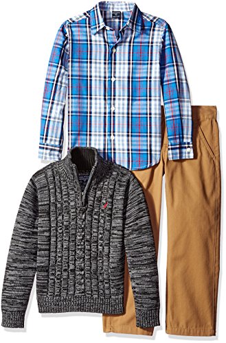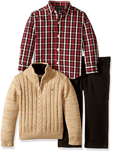 Nautica three piece set with a woven shirt, quarter zip sweater and flat front twill pants.