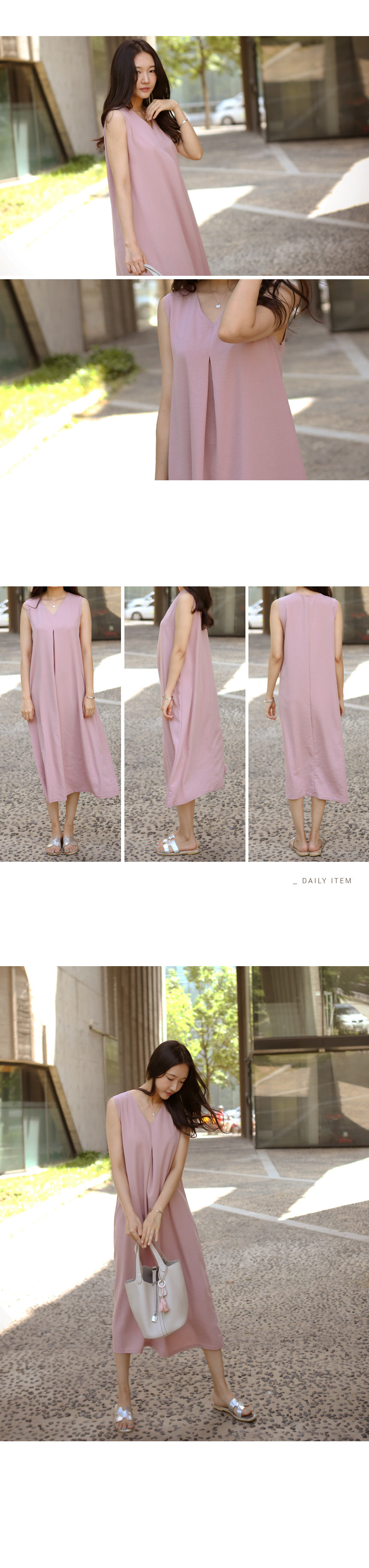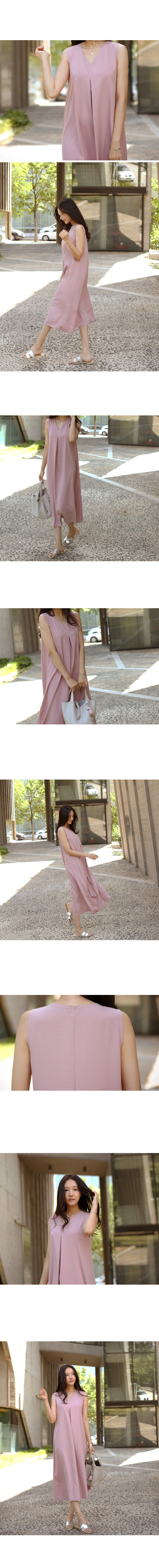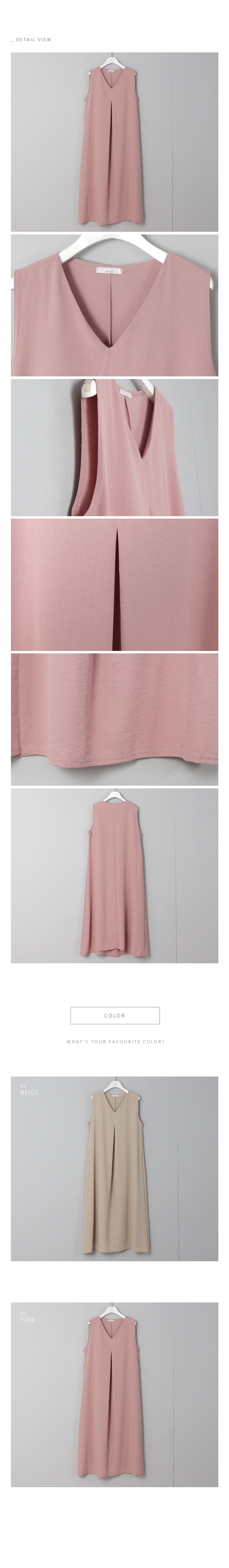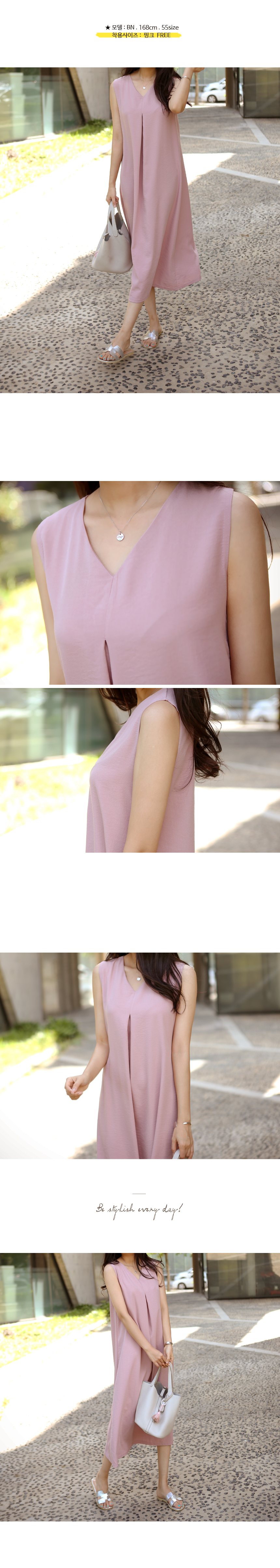 목선이 예쁘게 드러나는 브이넥에시원한 민소매로 앞중심에 잡은 주름이부드럽게 퍼지며 A라인으로마무리되는 롱한 길이감의 원피스에요레이온 혼방으로 특유의 실키한 촉감과저광으로 무게감있게 툭 떨어지는 소재감이고급스럽게 심플한 디자인을 잘 살려준답니다군더더기 없이 심플한 디자인과 소재로가디건, 자켓등과 코디하기에도 좋은 아이템이에요**소재특성상 찬물세탁 해주세요. 건조기 안돼요~!!색상은 베이지, 핑크사이즈는 FREE 44~66반