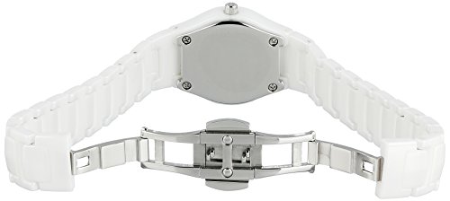 -. Feature : Round white watch with etched sunray dial featuring placed crystal indices, silver-tone logo, and dauphine hands / 24 mm white ceramic case with mineral dial window / Japanese quartz movement with analog display / White ceramic bracelet with deployant clasp and push-button closure / Water resistant to 10 m (33 ft)
