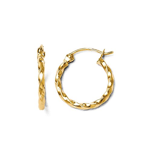 A timeless classic style featuring a twisted round design created from polished 14k yellow gold. This hollow hoop earring is approximately 1.8mm in width by 16mm (5/8 inch) in diameter. Made in ItalyFeature