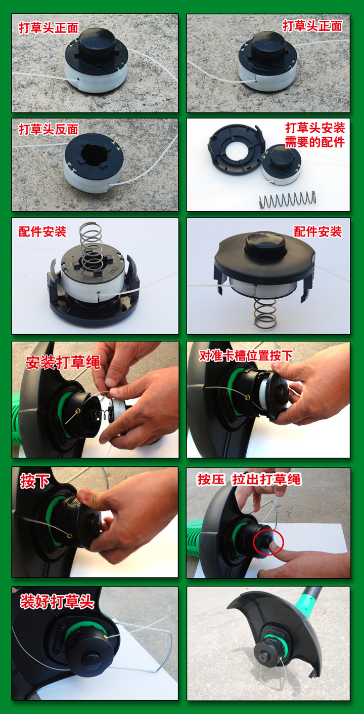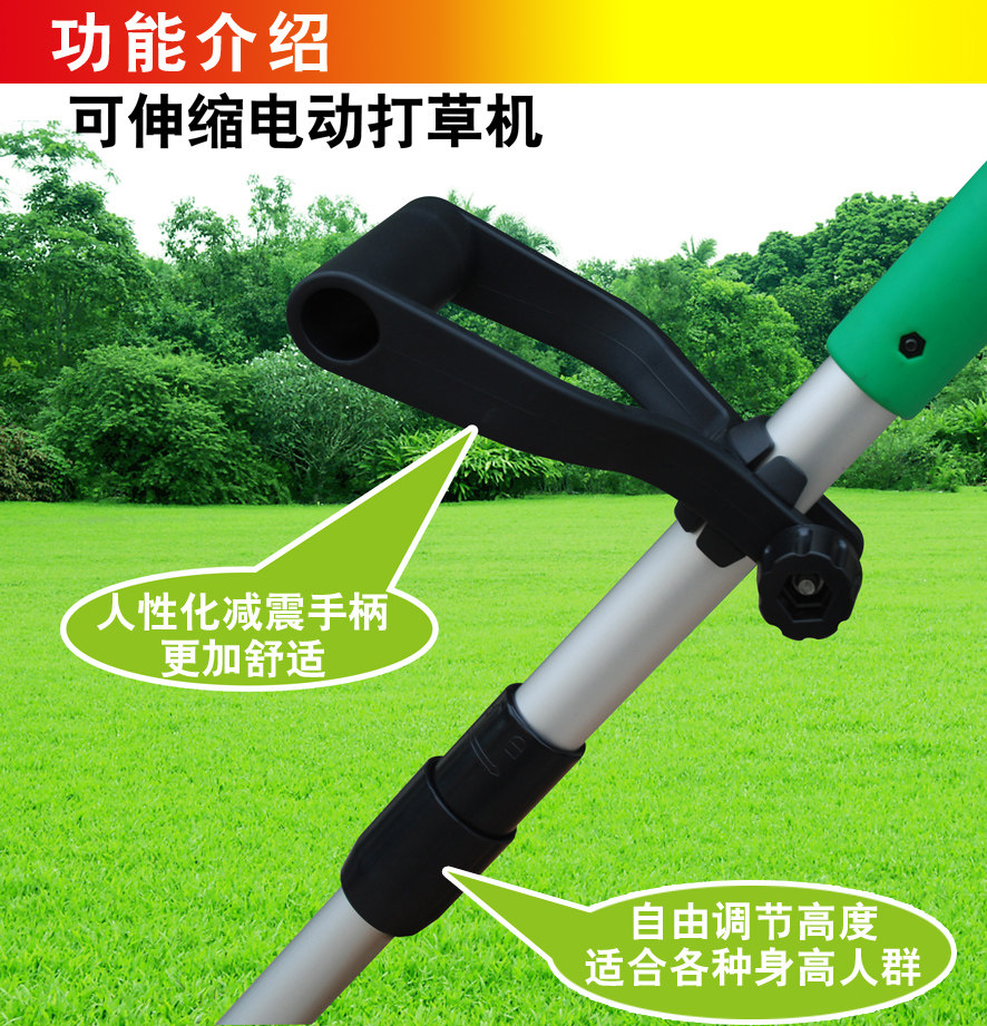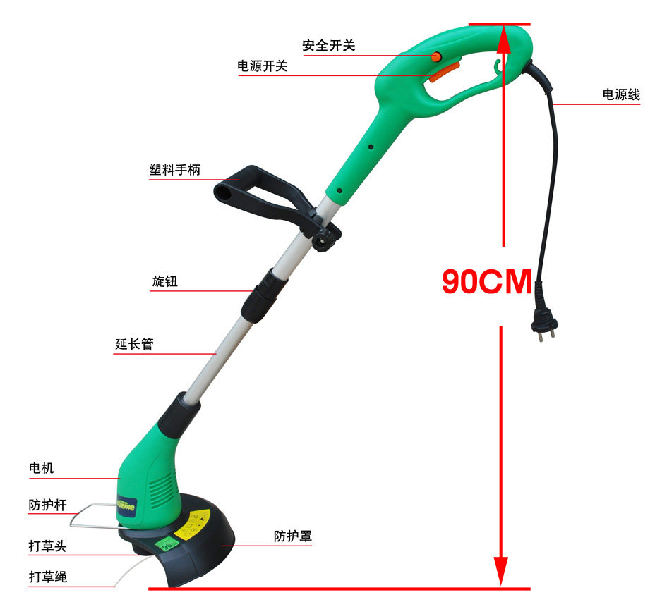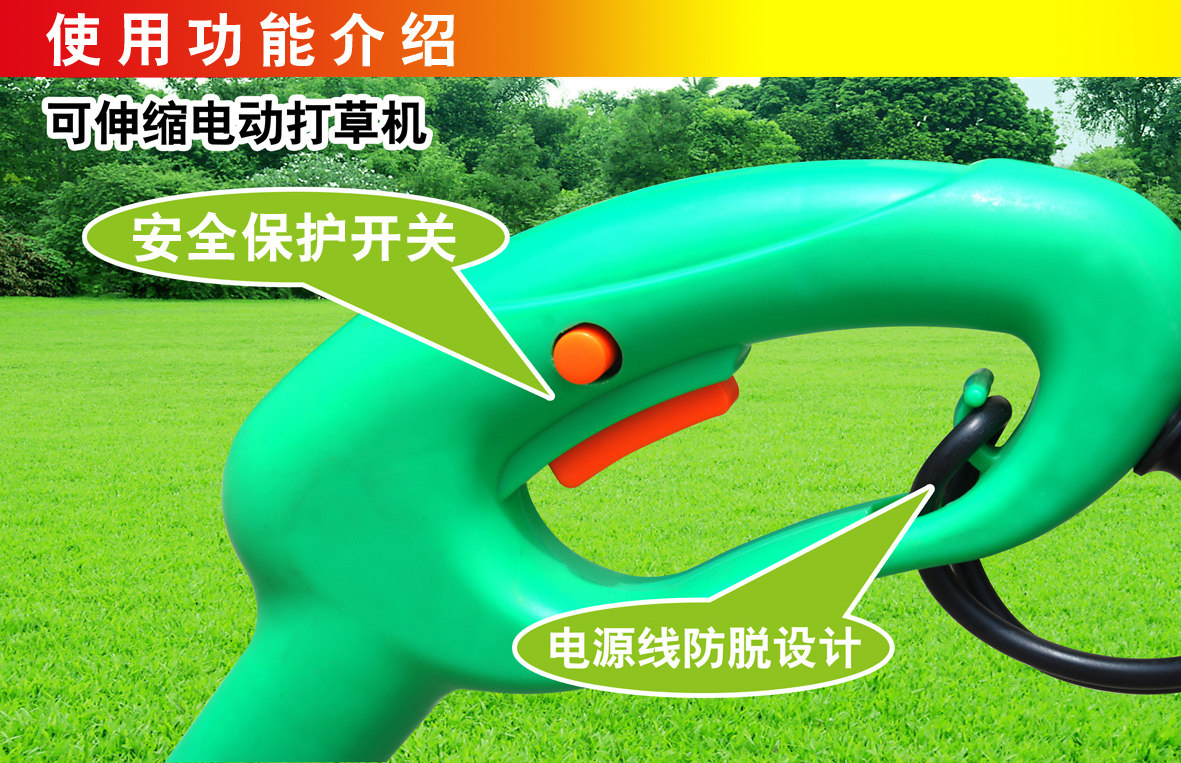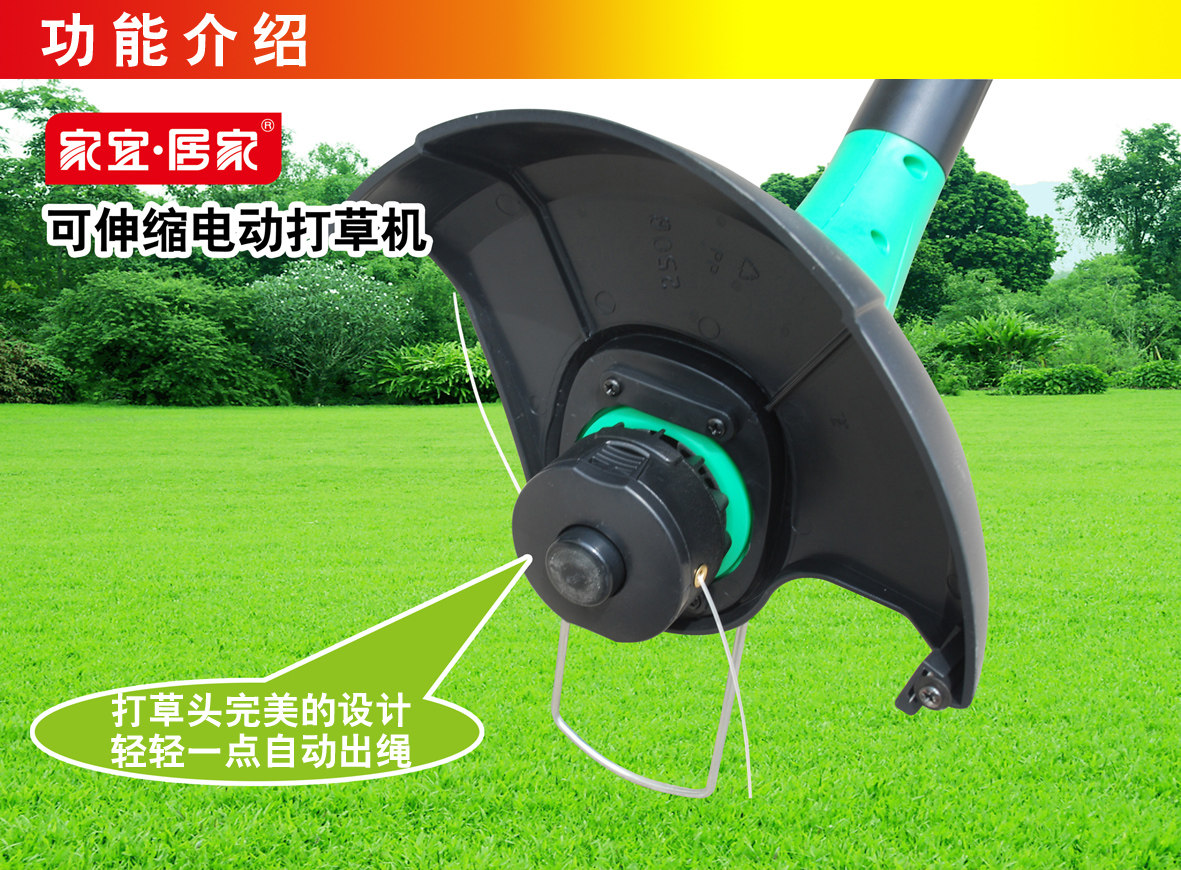 Mowing principle: the motor drives the nylon rope to rotate at high speed to achieve the purpose of mowing. Hand-held, body light and compact, slim ladies can also sway freely. On a small area of uneven lawn pruning or trimming, tree foot roots and other lawn mower can not cut to the place, choose this machine is absolutely right.