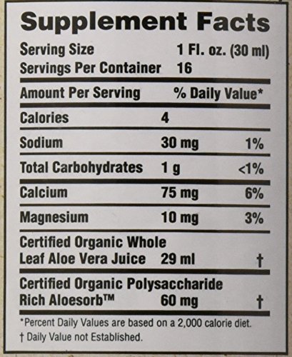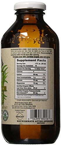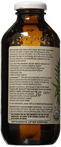 -. Binding : Health and Beauty -. Brand : Lily Of The Desert -. Department : Health and Beauty>Health and Wellness -. EAN : 0026395850167 -. Feature : Aloe vera juice whole leaf concentrate by lily of the desert 16 oz liquid aloe vera juice whole leaf concentrate 16 oz liquid lily of the desert has been a leading producer of aloe vera since 1971 / Our aloe vera products have been produced with certified organic aloe vera leaves which are grown in the fertile rio Grande valley of Texas / As the largest certified organic grower processor and distributor of aloe vera products we work hard to provide our customers with the purest aloe in the marketplace -. IsAdultProduct : 0 -. IsAutographed : 0 -. IsMemorabilia : 0 -. Label : Lily of the desert -. LegalDisclaimer : These statements have not been evaluated by the Food and Drug Administration. This product is not intended to diagnose, treat, cure, or prevent any disease. -. Manufacturer : Lily of the desert -. Model : 85016 -. MPN : 00091264 -. NumberOfItems : 1 -. PackageQuantity : 1 -. PartNumber : 00091264 -. ProductGroup : Health and Beauty -. ProductTypeName : HEALTH_PERSONAL_CARE -. PublicationDate : 2016-04-30 -. Publisher : Lily of the desert -. ReleaseDate : 2016-04-27 -. Size : 16 oz -. Studio : Lily of the desert -. Title : Lily Of The Desert Aloe Vera Juice Whole Leaf Concentrate Liquid, 16 Ounce -. UPC : 026395850167