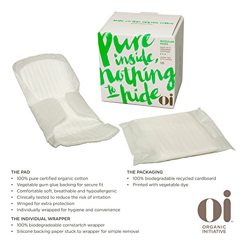 By choosing Oi you are saying "No" to chemicals and toxins, "No" to the use of crude oil plastics, "No" to perfumes, dyes and synthetics in and next to your body. You are saying "No" to environmental pollution and "No" to nondisclosure of ingredients. By choosing Oi you are saying "Yes" to transparency, honesty and integrity, and to knowing what ingredients are in your products. You are saying "Yes" to your health, "Yes" to biodegradability, "Yes" to the planet, "Yes" to comfort and protection and organics. All of Oi's products use 100% Certified Organic Cotton, are 100% biodegradable, and are even GOTS certified!