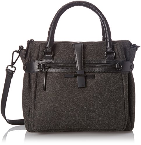 Pebbled-leather bag featuring textured top handles, snap-out expandable side panels, footed bottom, removable cross-body strap, and front slip pocket with metal tab closure