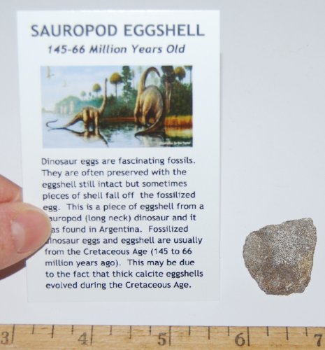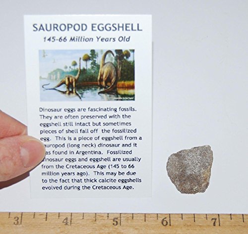 Studio : Fossils, Meteorites, More Publisher : Fossils, Meteorites, More Binding : Toy Product Description This a neat and unique item - it's a genuine piece of fossilized shell from a Sauropod dinosaur egg. THE ACTUAL PIECE OF SHELL YOU RECEIVE WILL NOT BE THE ONE IN THE PICTURE, BUT A SIMILAR PIECE. These pieces measure approximately 3/4 inch to 1 inch in length. Sauropods were the enormous long-necked dinosaurs that lived 188-65 million years ago. Included with the fossil is a nice color informational label. It's interesting to notice how much thicker the sauropod eggshell is than the Oviraptor and Hadrosaur shell. This item would be neat to have in your collection! 0