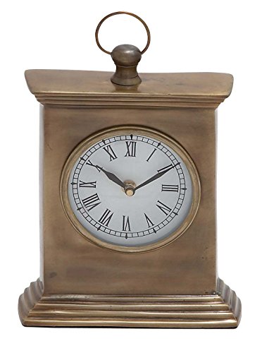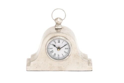 8" modern reflections rustic aluminum mantel clock, tarnished blemished silver-finish aluminum, knob finial with loop handle, 1 a battery-operated clock with glass crystal, black roman numerals on white faceplate, black hour and minute hands.Feature