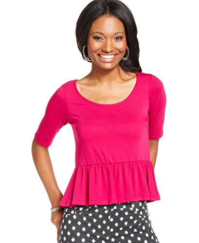 New With Tags, PLANET GOLD Peplum Crop TopManufacturer Color: FuschiaRetail: $29.00Condition: New with tagsStyle: Cropped top with peplum bottomClosure: Pull overChest measurement (flat): 16.5" across/33" around (unstretched)Length: 19.5"Fabric: 62% Polyester/33% Rayon/5% SpandexFabric type: Polyester knitFeature