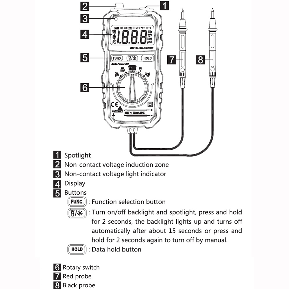 This instrument can measure AC/DC voltage, AC/DC current, resistance, diode and connectivity; with non-contract voltage detection function, timely remind the user to pay attention to operation safety, so it's more safe and rest assured for user to use.