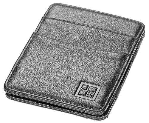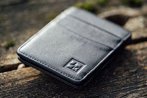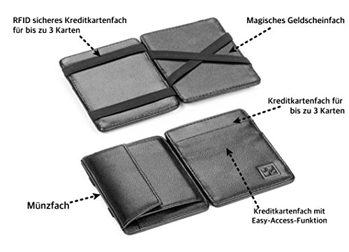 -. Feature : FLACH UND PRAKTISCH: Wer kennt nicht das Problem der überfüllten Geldbörse, die die Hose ausbeult oder die Handtasche in ein Sportgerät verwandelt. Durch unser flaches und innovatives Design, wird der Geldbeutel auf ein minimum reduziert. Ideal zum Ausgehen oder auf der Arbeit im Anzug. / SICHER DURCH RFID BLOCKER: Die meisten Kreditkarten oder Ausweise sind mit RFID Chips ausgestattet, die hochsensible Daten enthalten. Mit elektronischen Lesegeräten können Diebe diese Daten auslesen ohne, dass Sie es merken. Deshalb ist in dem Kreditkartenfach auf der Innenseite des Portmonnaies ein RFID blockierendes Material verarbeitet. Dadurch wird ein einfaches Auslesen von sensiblen Informationen verhindert und schützt somit Ihre Daten. / MAGISCHES GESCHENK: Durch die magische Klapp-Funktion wird der Bezahlvorgang an jeder Kasse zum echten Hingucker. Geldscheine werden einfach in den aufgeklappten Geldbeutel gelegt und durch einmaliges Umschlagen werden die Geldscheine, wie durch Zauberhand, hinter den Gummibänder fixiert. Die ideale Geschenkidee. Geliefert in praktischer Geschenkbox! / MÜNZEN SCHEINE UND KREDITKARTEN: Bei den meisten auf dem Markt erhältlichen flachen Geldbeuteln wird das Münzfach vergessen. Allerdings ist es fast nicht vermeidbar, dass beim Bezahlen das Wechselgeld die ein oder andere Münze enthält. Daher wurde bei unserem Design darauf geachtet, dass nicht nur bis zu 7 Kreditkarten und Geldscheine Platz finden, sondern auch Münzen ihr eigenes Fach haben. / Magic Wallet / Geldbörse / Portemonnaie / Geldbeutel Herren klein mit RFID Schutz. HINWEIS: Es handelt sich hierbei um einen speziellen Einführungspreis mit begrenzter Laufzeit. Daher nur solange der Vorrat reicht!!