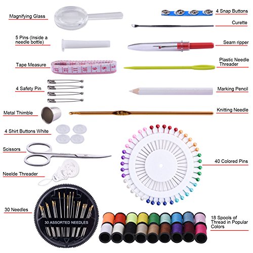 - ✂ COMPACT SEWING SUPPLIES - 40 colored pins(extra bonuses), 30 needles (golden), 18 spools of thread in popular colors(24-30ft), 5 pins (inside a needle bottle), 4 safety pin, 4 shirt buttons white, 4 snap buttons, measuring tape (inches & cm), stainless steel scissors, plastic needle threader, white marking pencil, magnifying glass, knitting needle, seam ripper, curette, thimble, threader