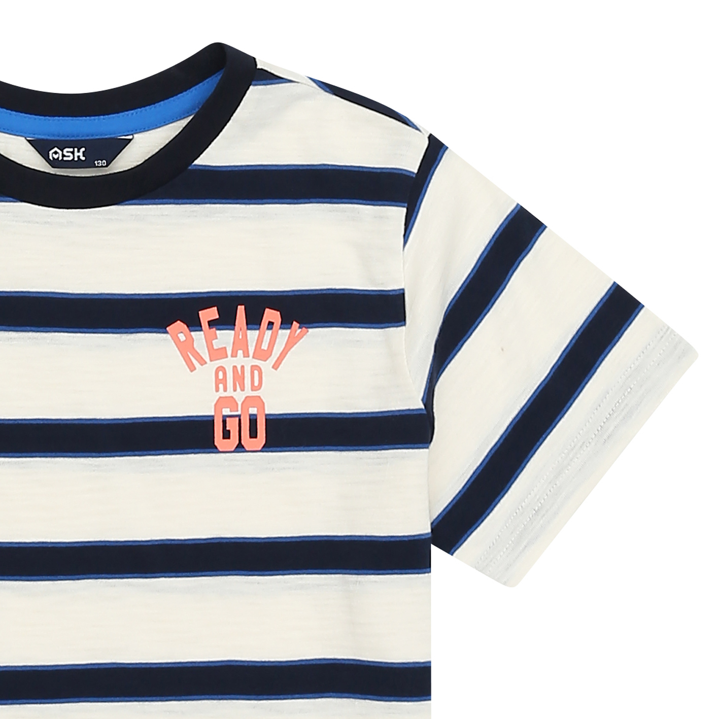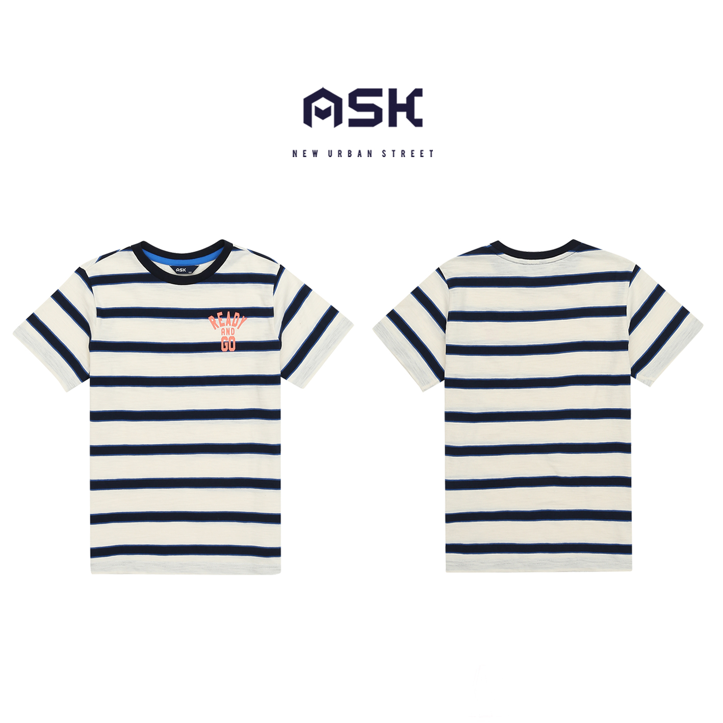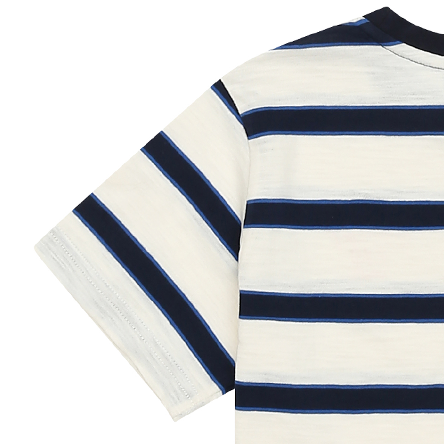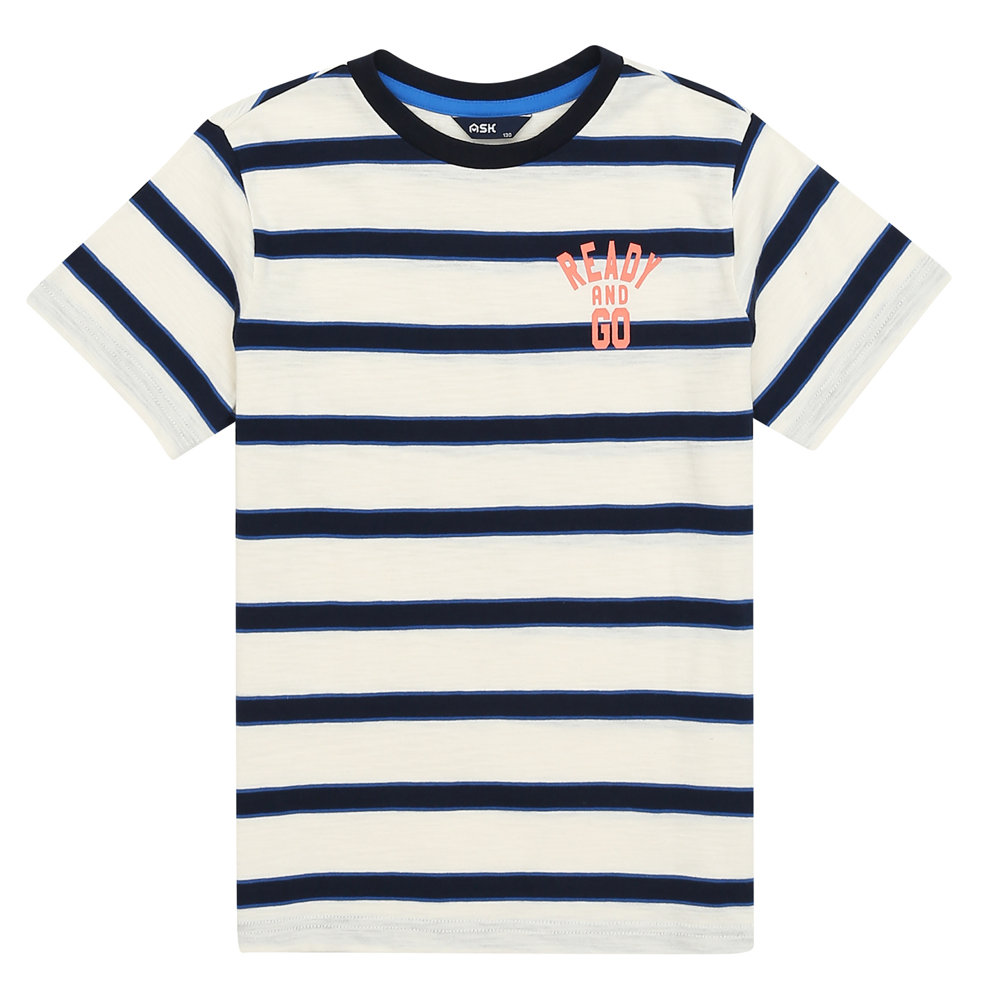 30수 선염 스트라이프 소재의 티셔츠. 가슴에 칼라감 있는 아트웍을 포인트로 준 기본 티셔츠. 남아 고학년까지 무난하게 입을 수 있는 아이템임.