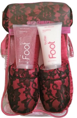 -. Feature : Spa Sister Satin Nights Foot Spa Set Kit (Red and Black Lace) / 1 Guava Foot Butter 6 fl. oz. / 1 Guava Exfoliating Scrub 6 fl. oz. / Red Black Lace Satin Slippers (one size, Large), / 1 Comfy Eye Mask.